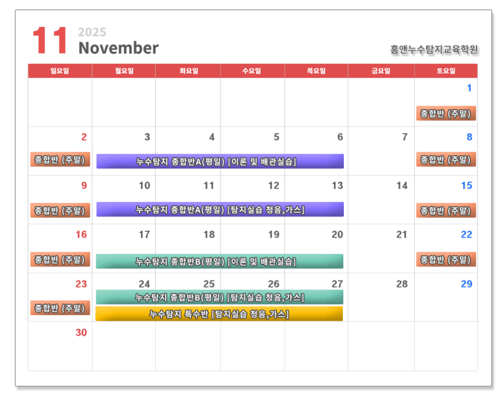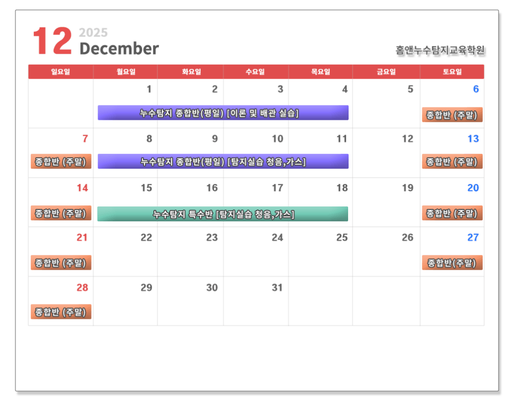 6명 선착순 모집 교육일정 아래 달력을 클릭하시면 자세한 일정을 확인 할 수 있습니다. 홈앤누수탐지교육학원 2025년 11월 교육일정 안내 홈앤누수탐지교육학원 9월 교육일정 안내 2025년 8월 홈앤누수탐지교육학원일정 안내 2025년 7월 홈앤누수탐지교육학원일정 안내 홈앤누수탐지교육학원 2025년 10월 교육일정 안내 2025년 12월 홈앤누수탐지학원 교육일정 2025년 6월 홈앤누수탐지교육학원일정 안내 2025년 5월 누수탐지창업 설명회 2025년 5월 홈앤누수탐지교육학원일정 안내