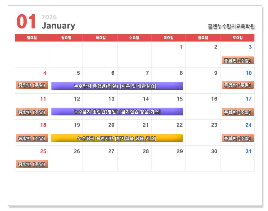 6명 선착순 모집 교육일정 아래 달력을 클릭하시면 자세한 일정을 확인 할 수 있습니다. 홈앤누수탐지교육학원 2025년 11월 교육일정 안내 홈앤누수탐지교육학원 9월 교육일정 안내 2025년 8월 홈앤누수탐지교육학원일정 안내 2025년 7월 홈앤누수탐지교육학원일정 안내 홈앤누수탐지교육학원 2025년 10월 교육일정 안내 2025년 12월 홈앤누수탐지학원 교육일정 2026년 1월 누수탐지 정규교육 일정 안내 2025년 6월 홈앤누수탐지교육학원일정 안내 2025년 5월 누수탐지창업 설명회