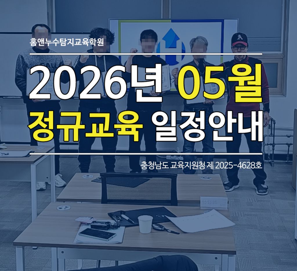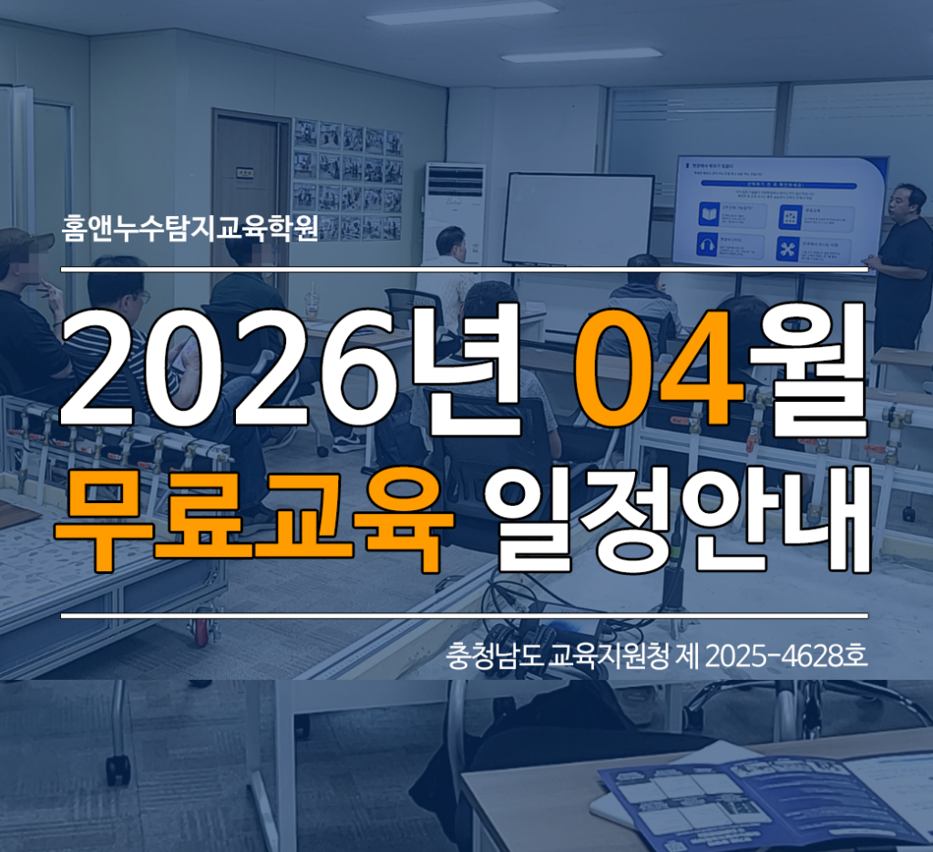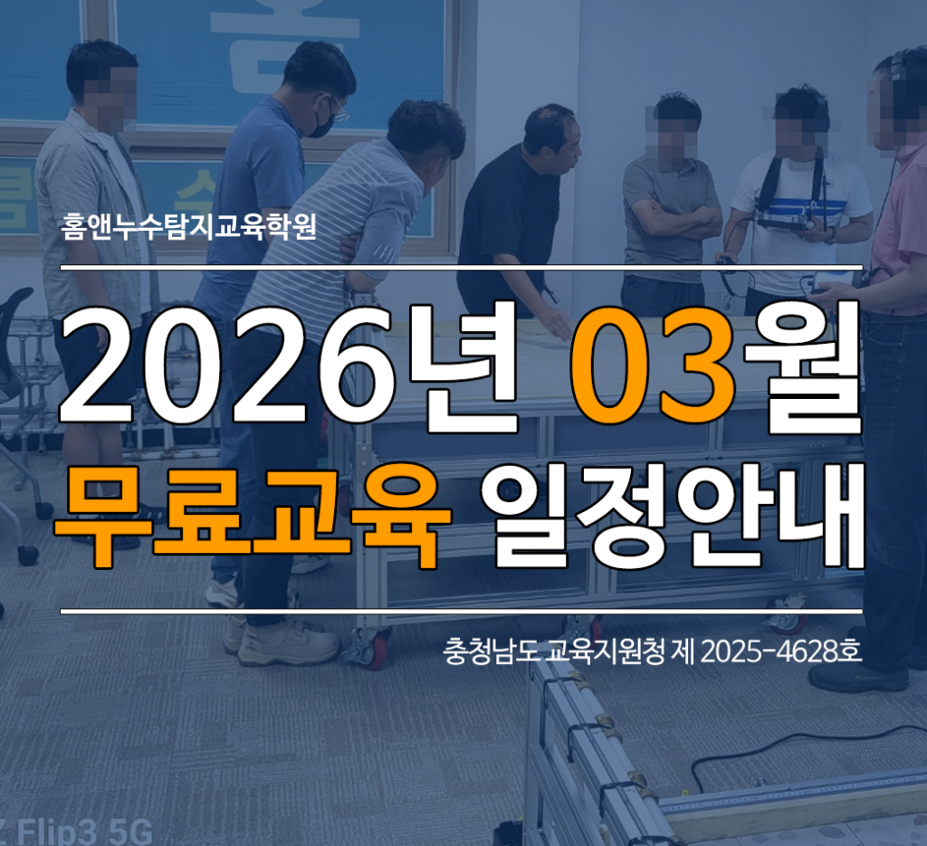 4명 선착순 모집 교육일정 아래 달력을 클릭하시면 자세한 일정을 확인 할 수 있습니다. 2026년 홈앤누수탐지교육학원 [5월 무료교육 일정안내] 2026년 홈앤누수탐지교육학원 [5월 정규교육 일정안내] 2026년 홈앤누수탐지교육학원 [4월 정규교육 일정안내] 2026년 홈앤누수탐지교육학원 [4월 무료교육 일정안내] 2026년 3월 누수탐지 정규교육 일정 2026년 홈앤누수탐지교육학원 [3월 무료교육 일정안내] 2026년 1월 누수탐지 정규교육 일정 안내 2025년 12월 홈앤누수탐지학원 교육일정 홈앤누수탐지교육학원 2025년 11월 교육일정 안내 Page1 Page2 Page3