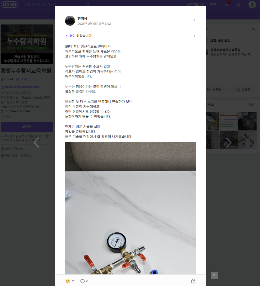 누수탐지 고민했던 분들의 생생한 후기를 확인하세요 수강생 100% 만족 도전! 네이버밴드 "홈앤누수탐지교육학원"에서 확인하세요. 조형석님 누수탐지교육후기 윤상훈님 누수탐지학원후기 한지용님의 누수탐지학원후기 김성봉님의 누수탐지학원 교육후기 오상민님의 누수탐지학원 후기 첫 현장 성공, 누수탐지교육 이후 한 달 정우철님 소중한 누수탐지교육후기 감사합니다. 기술과 마케팅의 균형을 정확히 짚어주신 소중한 후기 감사합니다 처음 장비 잡던 날이 엊그제 같은데, 벌써 현장 누비고 있습니다. Page1 Page2 Page3 Page4 Page5