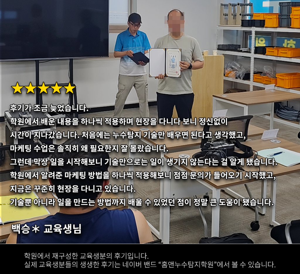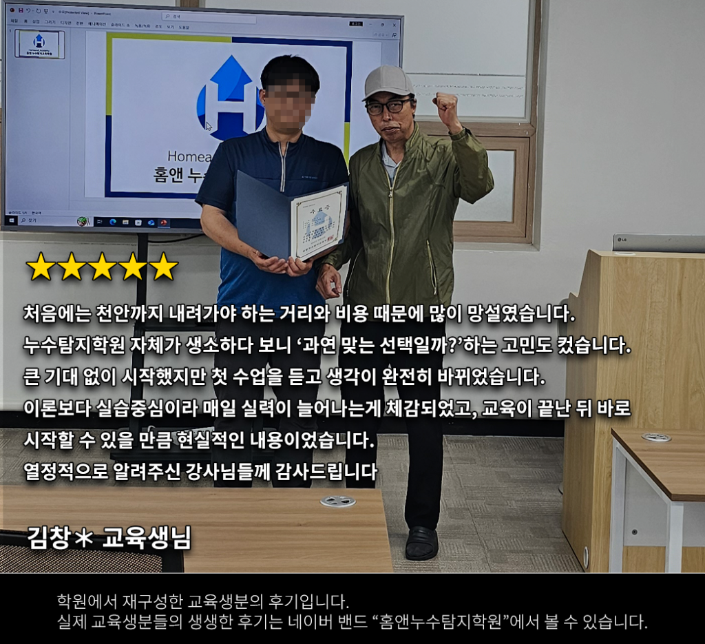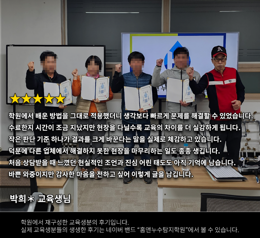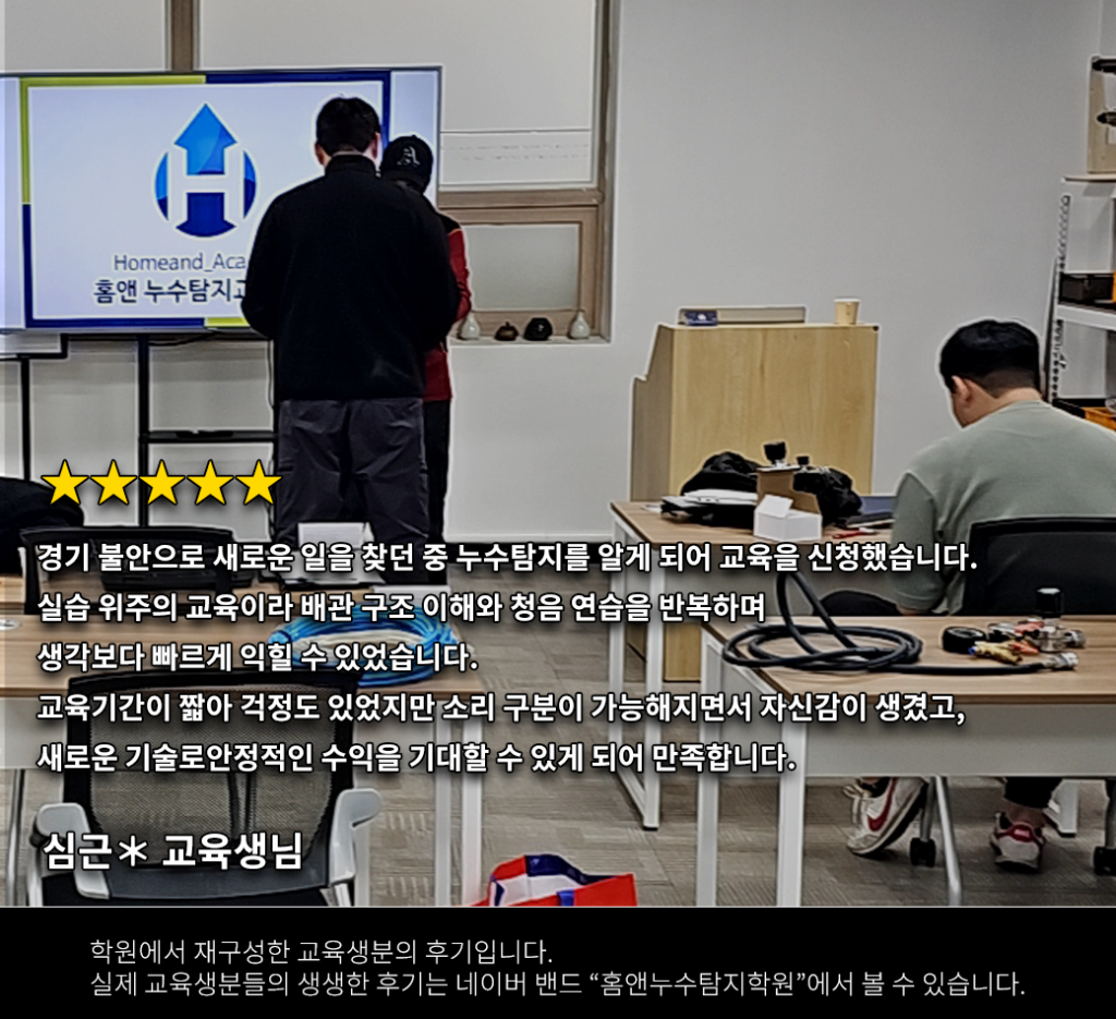 누수탐지 고민했던 분들의 생생한 후기를 확인하세요 수강생 100% 만족 도전! 네이버밴드 "홈앤누수탐지교육학원"에서 확인하세요. 심근○님 교육후기 -홈앤누수탐지교육학원- 이건○님 교육후기 -홈앤누수탐지교육학원- 백승○님 교육후기 -홈앤누수탐지교육학원- 박희○님 교육후기 -홈앤누수탐지교육학원- 임민○님 교육후기 -홈앤누수탐지교육학원- 윤종○님 교육후기 -홈앤누수탐지교육학원- 최종○님 교육후기 -홈앤누수탐지교육학원- 김창○님 교육후기 -홈앤누수탐지교육학원- 박수○님 교육후기 -홈앤누수탐지교육학원- Page1 Page2 Page3 Page4 Page5 Page6 Page7 Page8
