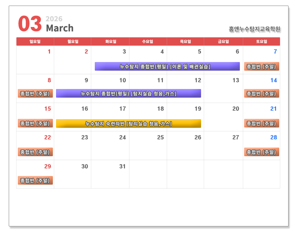 | 누수탐지 종합반 (평일) | 2026년 3월 3일 ~ 3월 12일 |